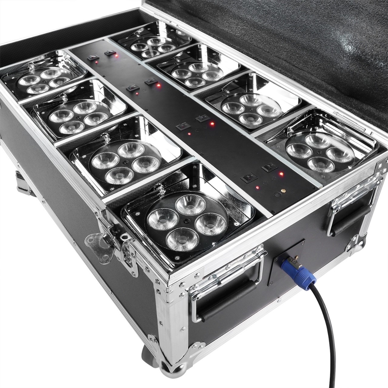 1 case of 8 lights. They run for 3-4 hours at full power, with effects, or 10 hours on single colour. Time to charge 4hrs. Can be controlled by DMX, or run as standalone unit, sound active, auto operation and Wifi. Built in stand.