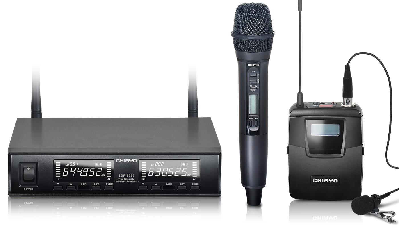 This Dual Wireless Microphone Package includes one Lapel (tie clip) microphone and one handheld microphone, paired with the SDR-6220 UHF dual-channel receiver, designed for exceptional performance in various professional settings. The receiver utilizes digital frequency synthesis technology for quick and precise channel searches, ensuring reliable, interference-free audio transmission. The IrDA® synchronization technology allows for easy frequency synchronization with just a single touch, simplifying setup and operation.