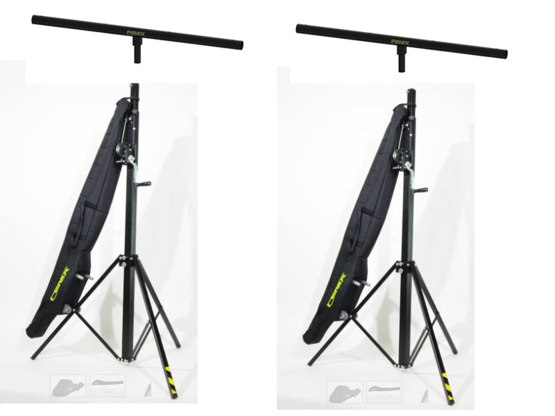 A pair of Nemesis 110 lighting / speaker stands with T-Bars and carry bags for applications such as lifting speakers, lighting, sound systems and truss.