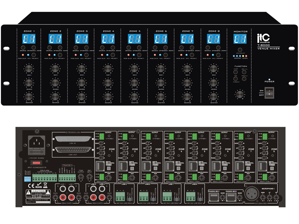 The 8 zone T-8000 provides multi-zone multi room audio distribution, paging and multi-source audio selection and is a complete solution for multi-room audio, multi-functional venues like clubs and sports bars, large hotels, sports and gym centers, shopping malls and airports, multi-room conference venues etc.