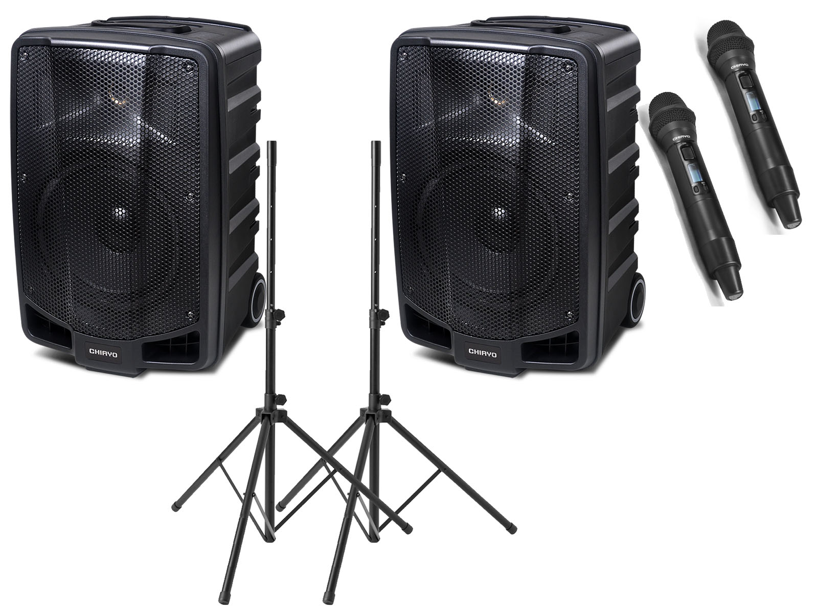 This APEX PRO PORTABLE PA HIRE PACKAGE comes complete with the Master Speaker and a wireless Slave speaker, TWO handheld wireless microphone and speaker stands ready to use.