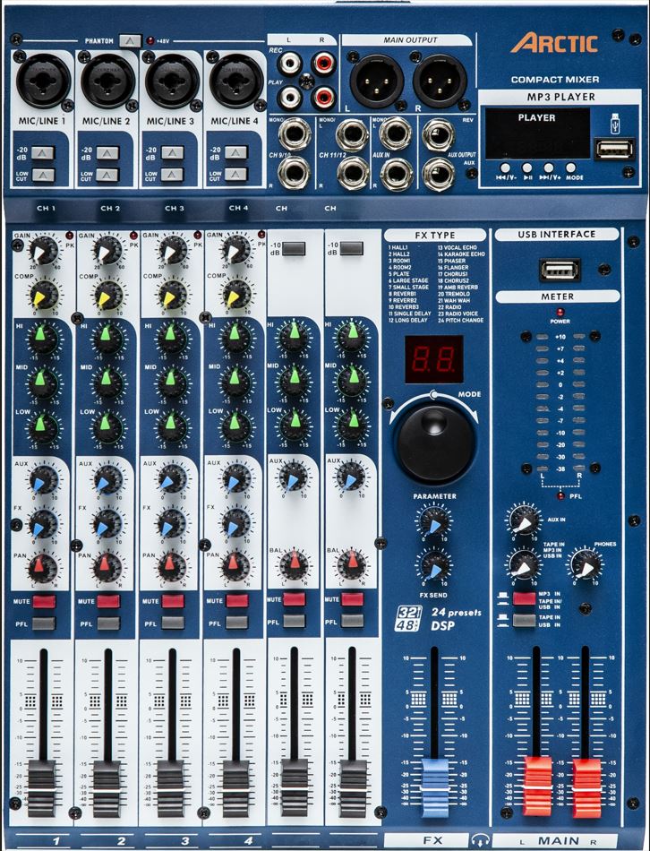 8 Channel Audio mixer with high quality effects, USB in and out for recording and playback, 4 mono inputs and 2 stereo inputs.