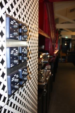 Although the zone control for the audio and video is very high-tech, as is all the processor-controlled digital gear behind the scenes, Edwards saw no reason for visible LCD touchscreens that could detract from the heritage feel of the pub. Instead Edwards proposed a physical source selector and volume control on the wall behind the bar that is easy to access and use. A part timer could operate the proposed system with no training. Stephen comments, “It is so simple even my brother can use it which means its awesome!”