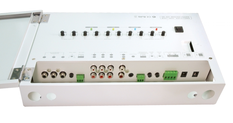 The IRX2 Amplifier / IR Receiver is built within a secure, tamper-proof, steel wall-mount case & features 2 x 50W RMS amplifier and 2 channels of Infrared receiver inputs.