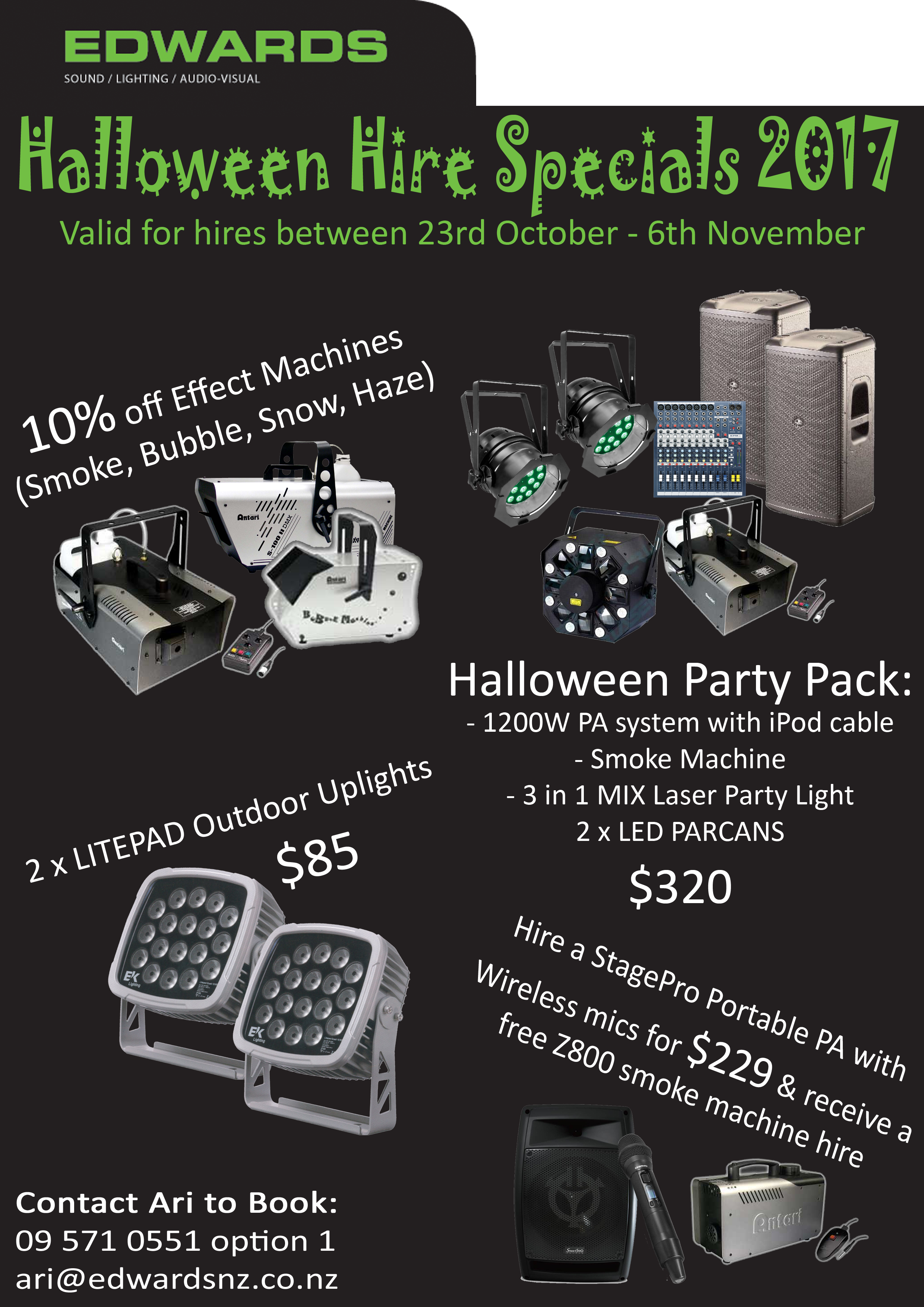 EVERYTHING you need to turn any space into a Halloween nightmare! Lighting, special effects, smoke, haze and sound systems all at scarily amazing prices. Download the flyer.