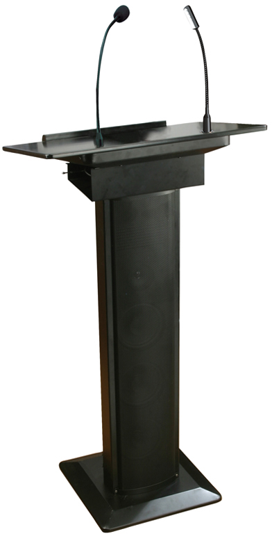 This portable powered lectern with built in amplifier and speakers, flexible goose-neck microphone and goose-neck lamp is a complete lectern and PA system package suitable for school halls, churches, meeting rooms and conferences.