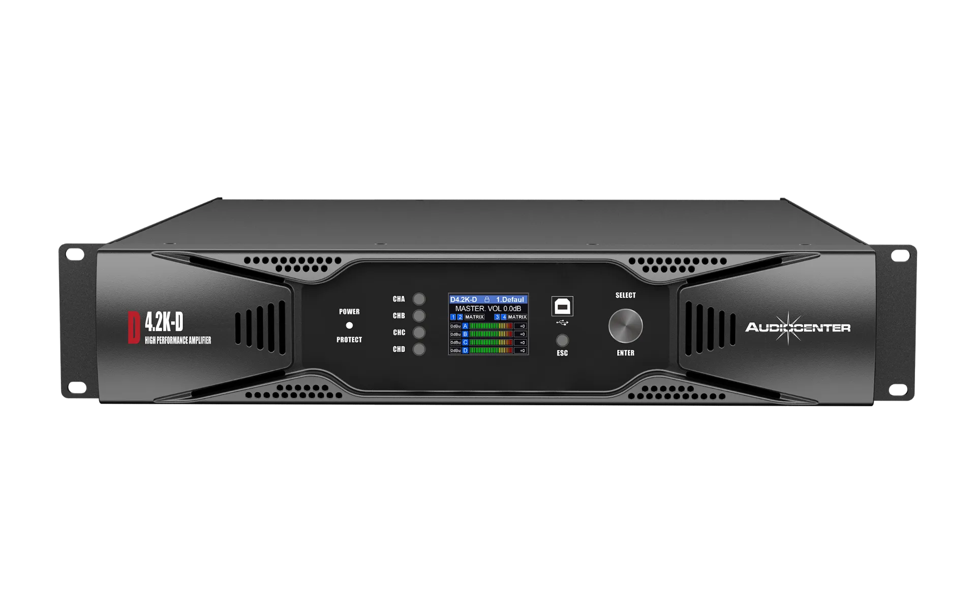 The D4.2K-D is a professional-grade, 4-channel digital power amplifier in the Audiocenter D Series, designed for high-performance audio installations where clarity, control, and network flexibility are paramount. Delivering up to 4×500W @4Ω or 2×1000W in bridged 8Ω mode, the D4.2K-D features Class D amplification, built-in DSP processing, and Dante digital audio networking in a compact 2U rackmount chassis.