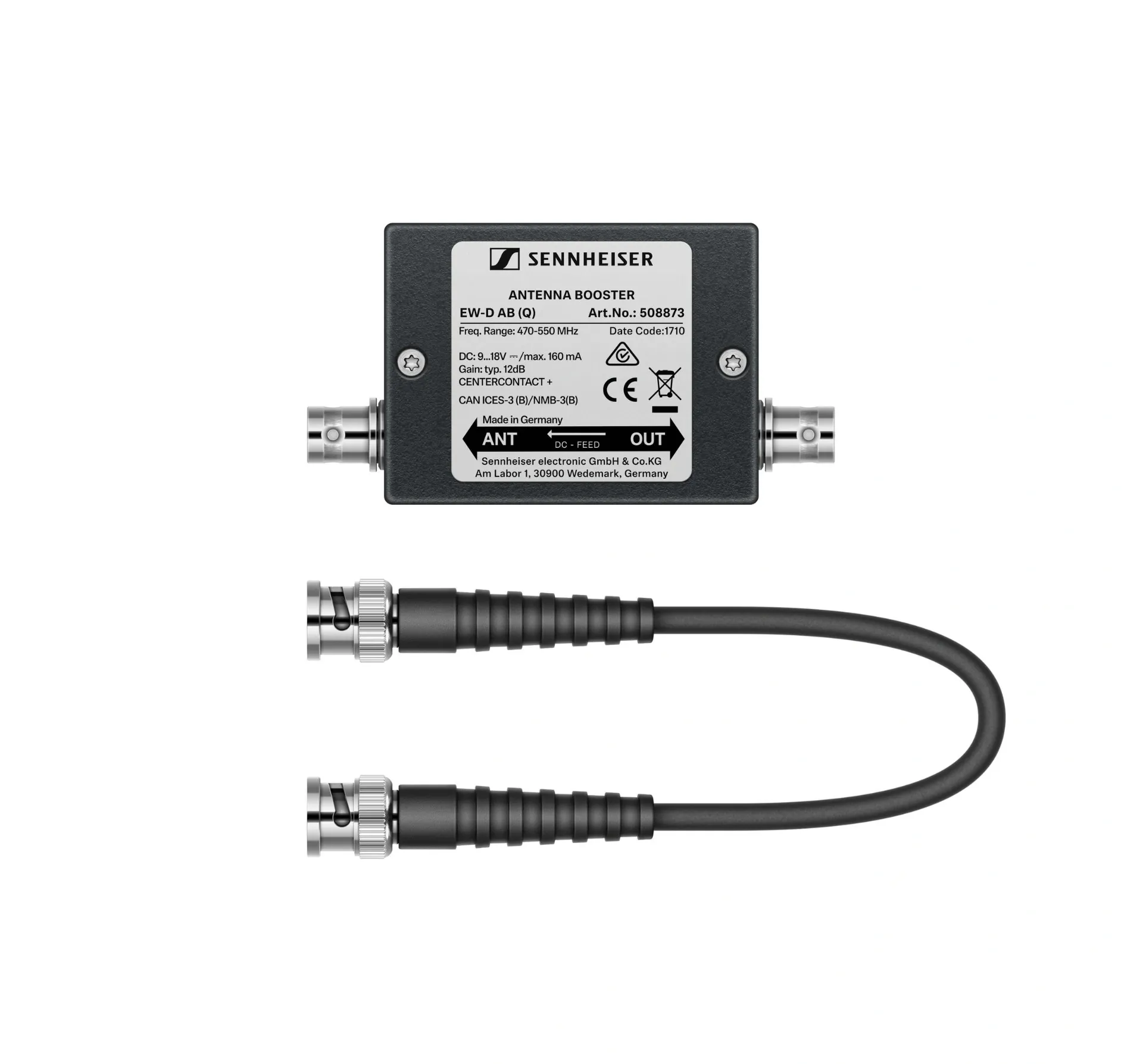 The Sennheiser EW-D AB is an inline antenna booster designed to enhance signal strength for Evolution Wireless Digital (EW-D) systems operating in the R Band (520 - 608 MHz)